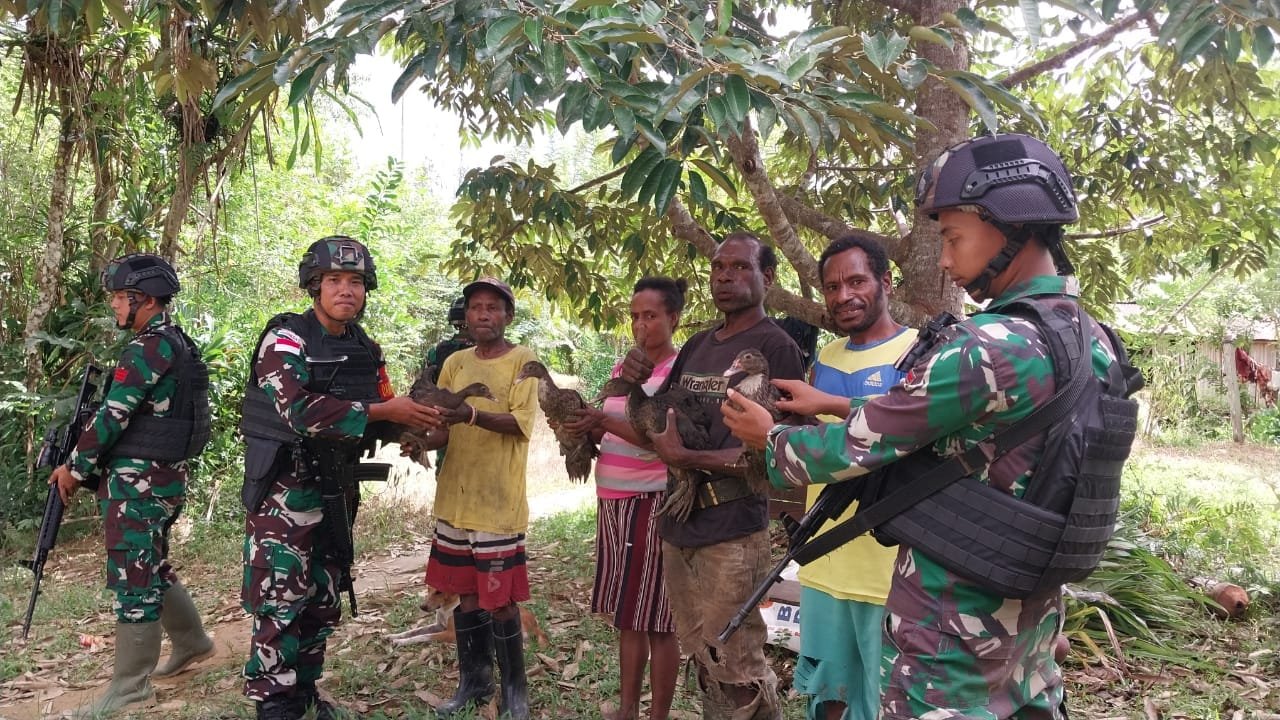 Keerom – Seputar Jagat News. Jum’at 6 September 2024. Kemanunggalan TNI dalam menjaga dan meningkatkan hubungan yang harmonis, Pos Yuruf Satgas Yonif 310/KK lakukan anjangsana ke rumah-rumah warga serta berikan hewan ternak berupa bibit entok untuk tumbuhkan minat berternak sehinga selain dikonsumsi dapat juga dijadikan nilai ekonomis di Kampung Yuruf II, Distrik Yaffi, Kabupaten Keerom, Jumat (6/9/2024).
